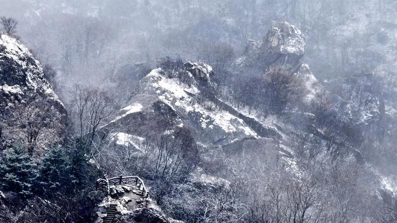 12月12日,翠華山迎來今冬第二場降雪,連綿起伏的山巒被皚皚白雪盡數(shù)包裹,原本雄奇的峰巒平添幾分婉約之態(tài),漫天飛絮般的雪花簌簌飄落,與嶙峋石海、巍峨翠華峰、澄澈天池相映成趣,將山間景致暈染成一幅幅渾然天成的冰雪山水畫卷。